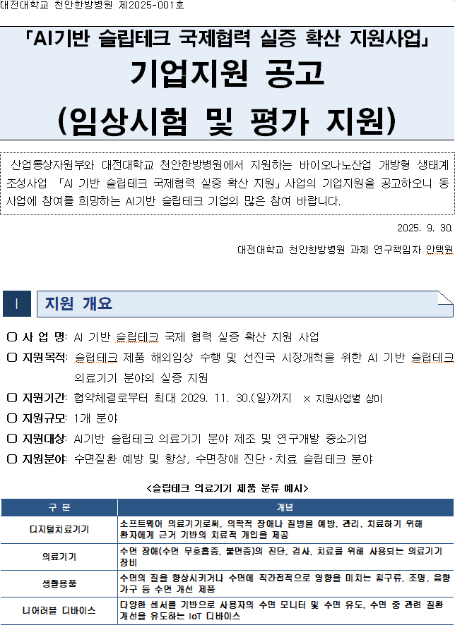 「AI기반 슬립테크 국제협력 실증 확산 지원사업」 기업지원 공고 (임상시험 및 평가 지원) |