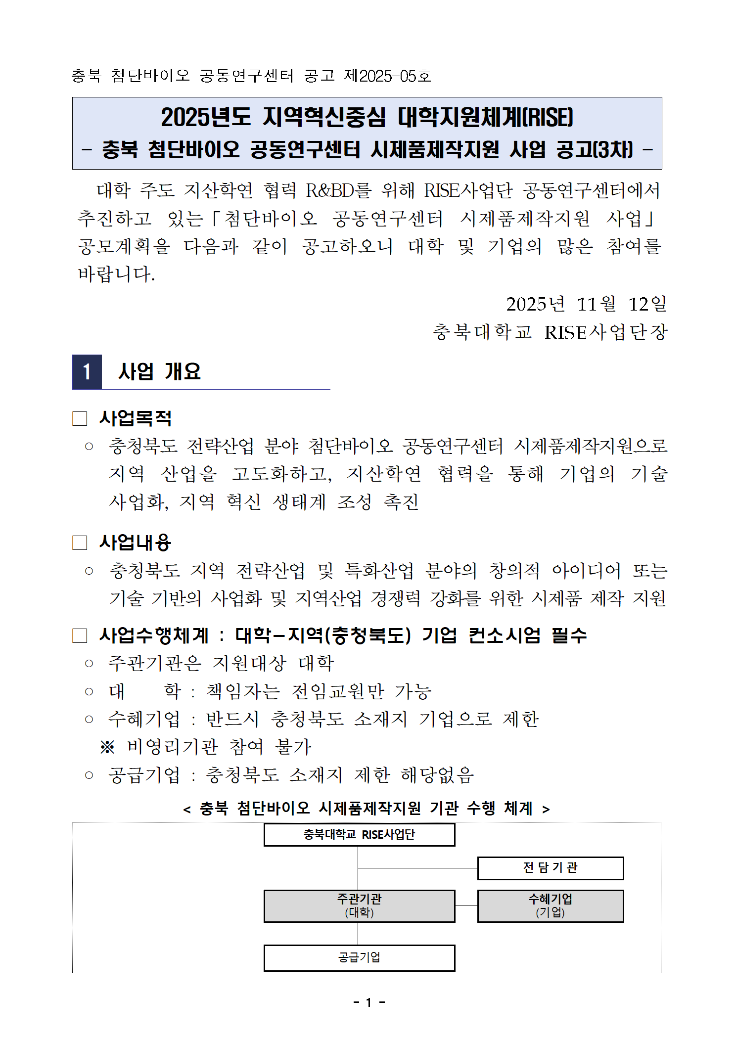 | 공고명 | (RISE) 충북 첨단바이오 공동연구센터 시제품제작지원 사업 공고(3차) | 비고 | ||||||||||||||||||||||||||||